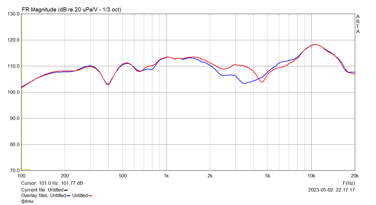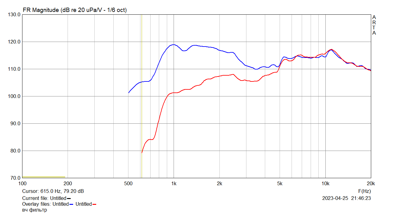 Понизил частоту раздела, всунув временно феррит в катушку ФНЧ. Фильтры 600+Х мкГн+6,6 мкФ и 7,7 мкФ вместо 6,7 в ФВЧ. Высокие превалируют.