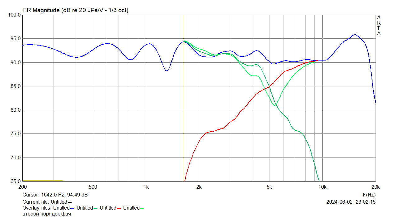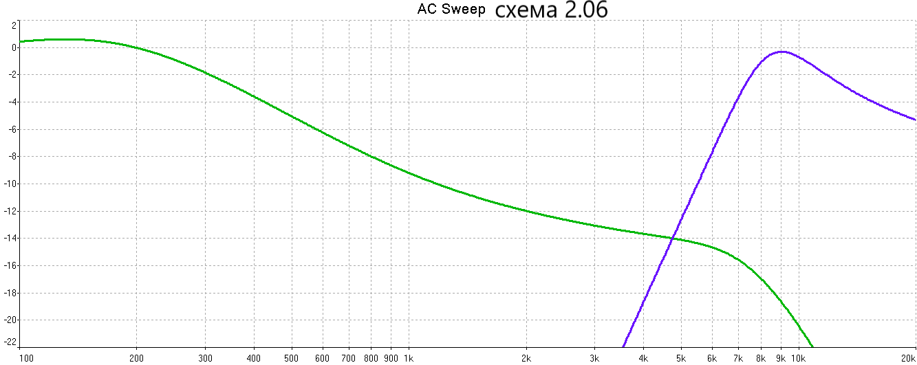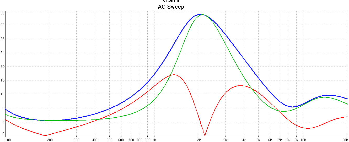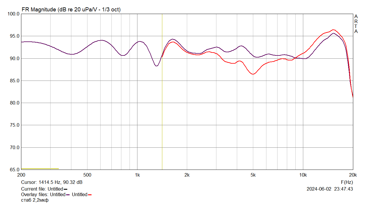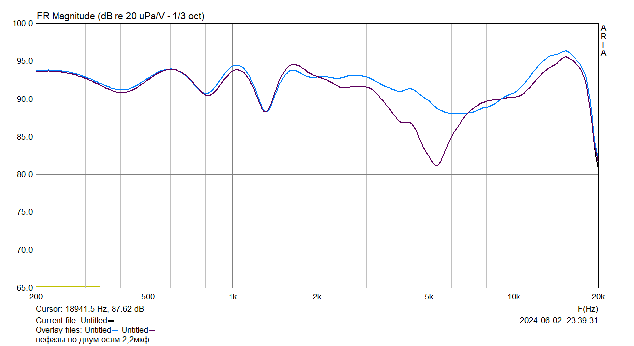АЧХ с 2,2 мкФ по оси НЧ (тёмно-вишнёвая) и по оси посередине (красная):