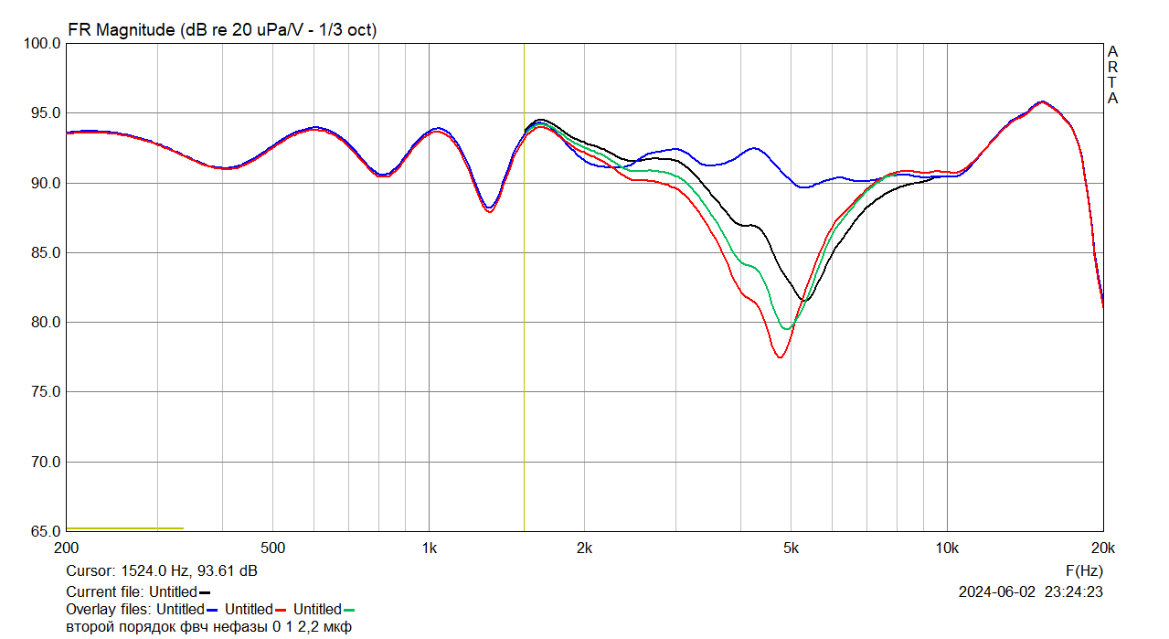 Если играться конденсатором в ФНЧ, то получим вот такие нефазы для 0 (красная); 1 (зелёная); 2,2 мкФ (чёрная), по оси НЧ.