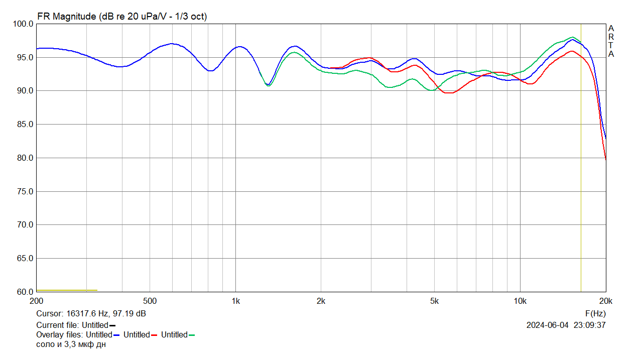 Как видим, 10° от оси - ни о чём до частоты 5,5 кГц. Я думал, что намного хуже! Сравнение АЧХ катушка соло/+1мкФ/+2,2мкФ по оси динамика: