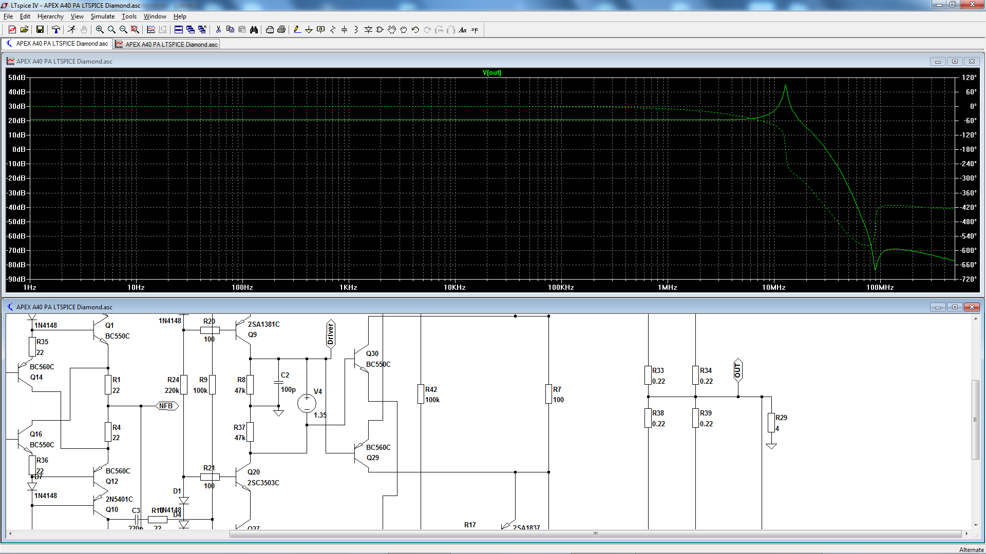 Первый график целиком усилитель - видим какой-то странный низкодобротный горб на ВЧ. Начинаем разбираться...