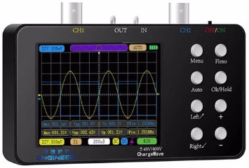 Экранчик 3.2". До 2-х МГц любая кривулька идентична со взрослым настоящим осциллоскопом (выше 10-12МГц – индикатор-показометр). Генератора нету, внутрях токовый шунт (0.05Ω, 6А макс) + токометр. Щупом х10 розетку щупал – не пшикнул