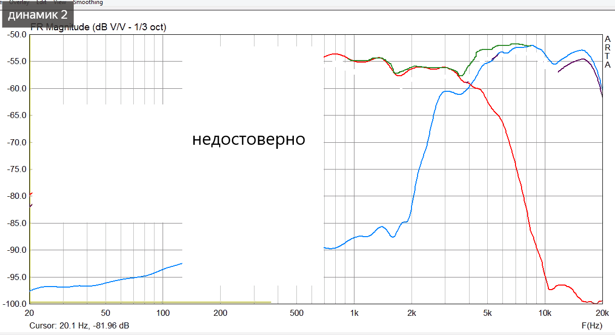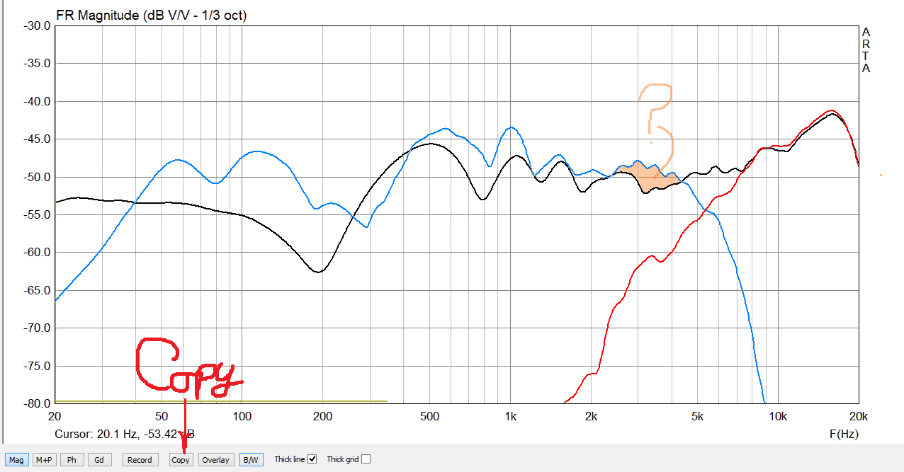 1.png - Вы не пользуетесь кнопкой Сорy, она сохраняет сам рисунок, его можно подписать, там галочки есть. Вы не приводите три АЧХ (НЧ, ВЧ, сумма) в одинаковых условиях: синяя и чёрная не совпадают, и я не знаю (и никто не знает): то ли оранжевая фигура - от того, что Вы привели НЧ и сумму с разным временнЫм окном, то ли это указывает на конкретно побитые динамиками горшки: работу излучателей в противофазе.
