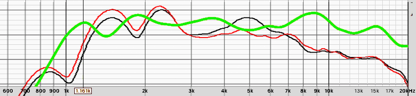 Не считая двугорбости вместо одного пика на частоте механического резонанса (это - проблемы динамика, не микрофона) - похоже на правду, причём красный ближе.