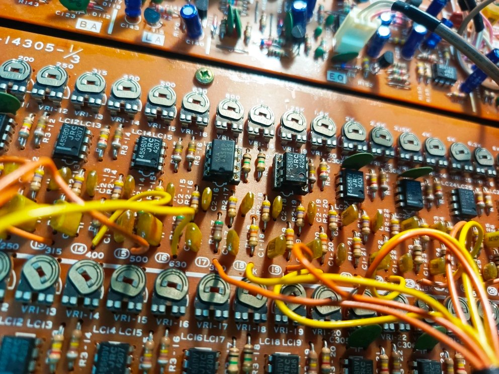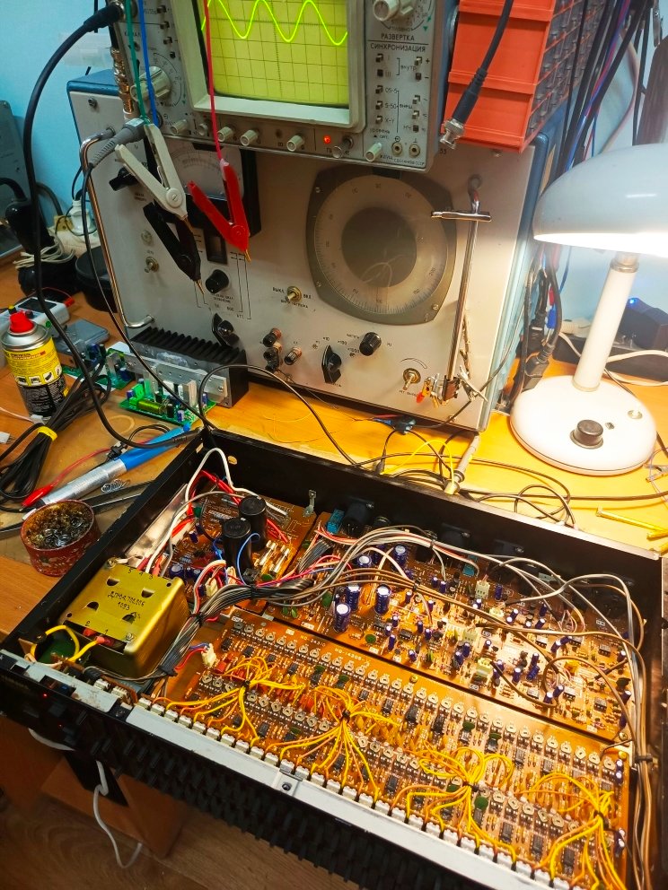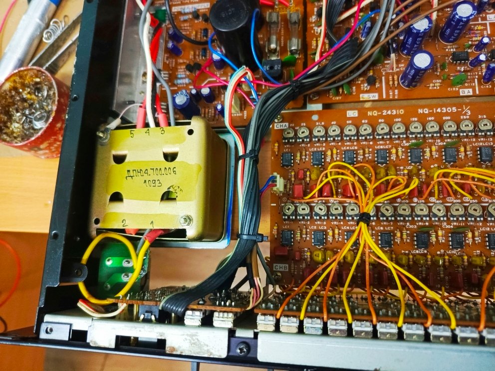 Перед Новым годом купил. Только сейчас руки дошли. Предыстория: брат раз в год приезжает, мы с ним молодость вспоминаем (играли вместе, он на ритме, я на клавишах) пенсни* поем, баня шашлыки..Но начинаешь наваливать, микрофоны заводятся. Непорядок. Купил подавитель обратной связи и эквалайзер. Эквалайзер не работал, но ничего существенного...блок питания, заодно трансформатор наш поставил (перевел со 100 вольт на 230), непропай, несколько фейдеров и опер на фильтре 1кГц и 1,25кГц.