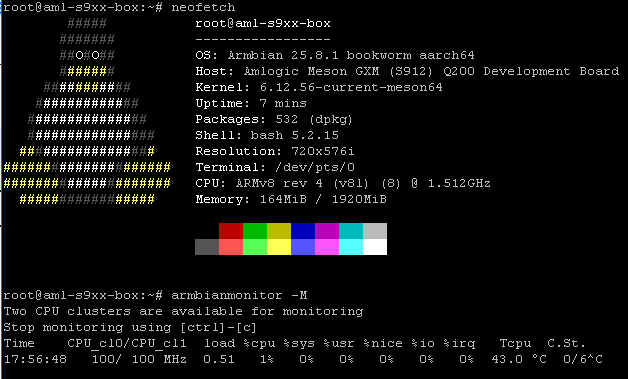 Приятный бонус в этой коробочке, это возможность переноса Линукс во внутреннюю память. Скрипт Armbian сработал без ошибок и теперь система стоит вместо Андроид, SD карта не нужна.