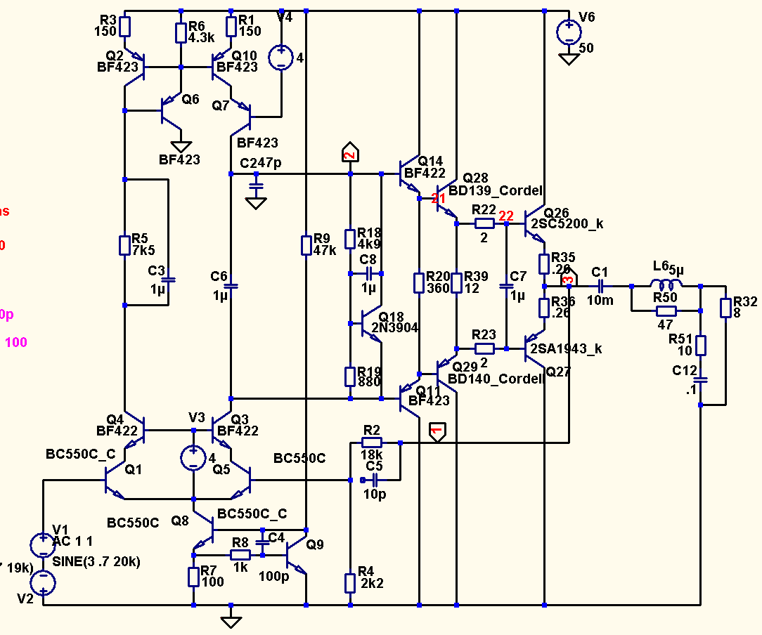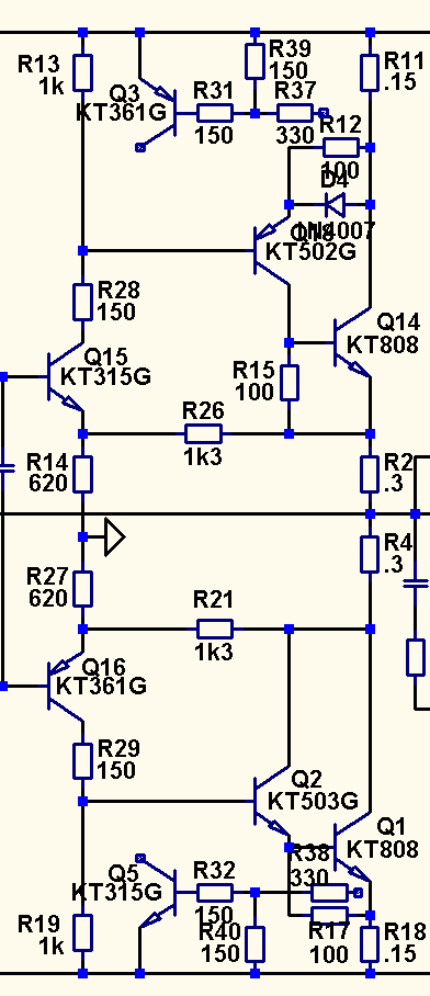 Поэтому вернемся к усилителю Арасланова. Там ВК с усилением аналогичен таковому из усилителя Корнева из Радио 4/1983, с той лишь разницей, что у Корнева после ОЭ двойка повторителей стоит, что конечно более выгодно и позволяет с меньшей девиацией тока работать этому самому ОЭ.