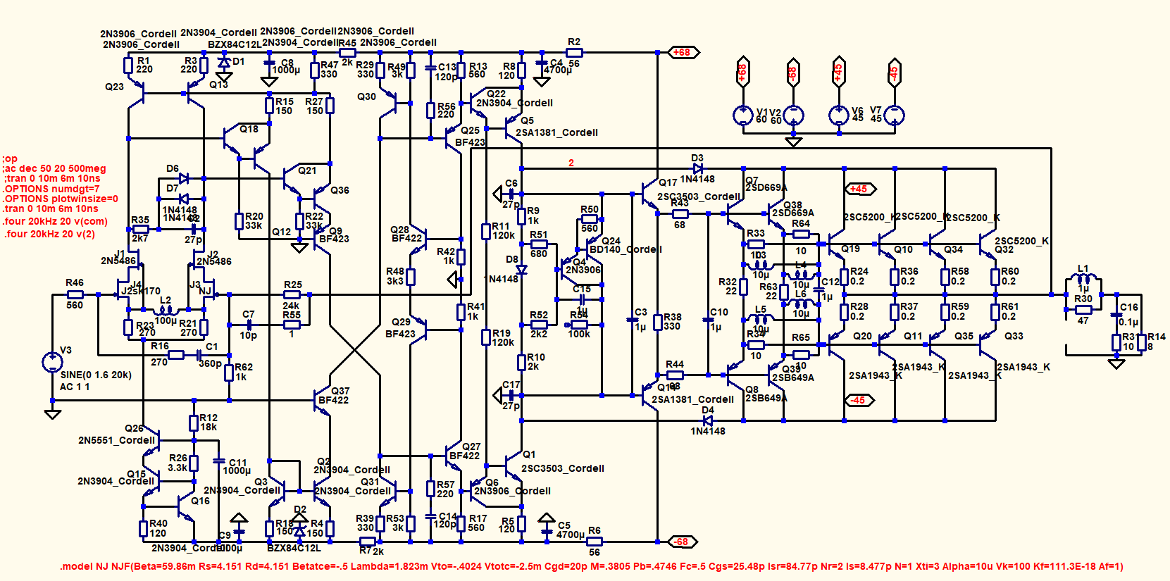 40 транзисторов чтобы получить 0.004% гармоник на 20кГц при учёте 10 гармошков, на 8ом. Ну я хрен его знает. ) Я ожидал честно говоря большего от такой здоровенной схемы.