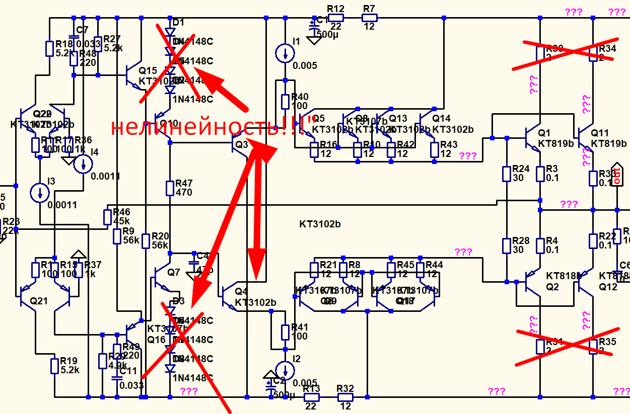 Вообще, сам по себе параллельник в 10 раз нелинейнее дифа. То есть, на те же 20 дБ, в стоке о двух транзисторах, без линеаризации плюс двумя транзисторами каждое плечо. Если ещё и с нею, то см. Эльбрус: приобретаются дополнительные качества - способность работы от высокоомного РГ, с которым Нихеровато Накадулю закономернейшим образом обсерется с головы до ног.