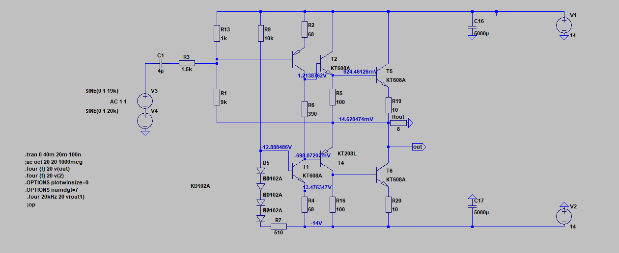 Ну а чего тут пока? Пока у нас не усилитель а генератор неопределённого сигнала получился. Кстати выходной каскад работает с небольшим током покоя в размере 4 ампер. КТ814/815 на такой ток никак не рассчитаны.)