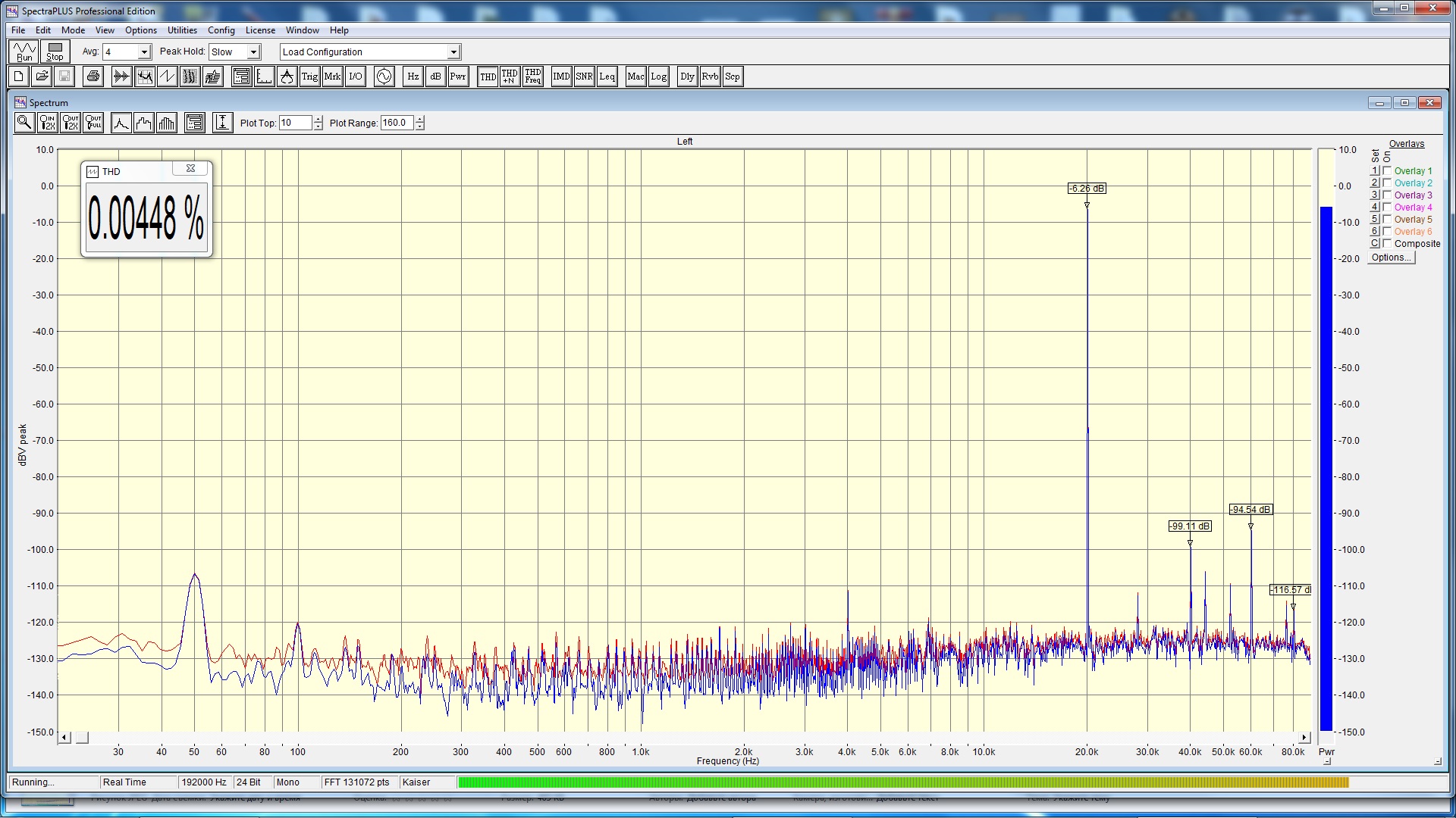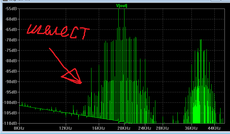 Подал на вход 4 сигнала. Напряжения спадающие (ну типа имитация реального музыкального сигнала) - 0.8V для 200 Гц, 0.4 для 2КГц и 0.2 для 19К и 20К. Ну что сказать? Результат так себе - одного каскада УН не достаточно. Хотя вата на 3 - 4 можно будет слушать...