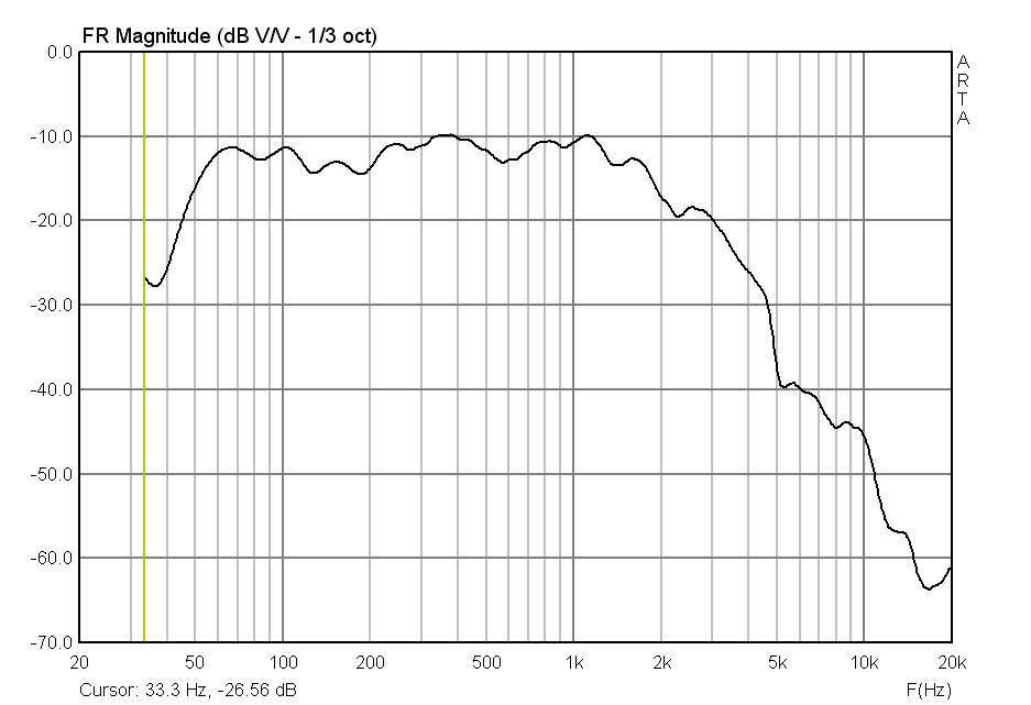 При измерении с 1 см шиш на 3 кГц, думаю из-за очень жесткого и большого колпака, но уже с 30 см в ящике 7 литров
