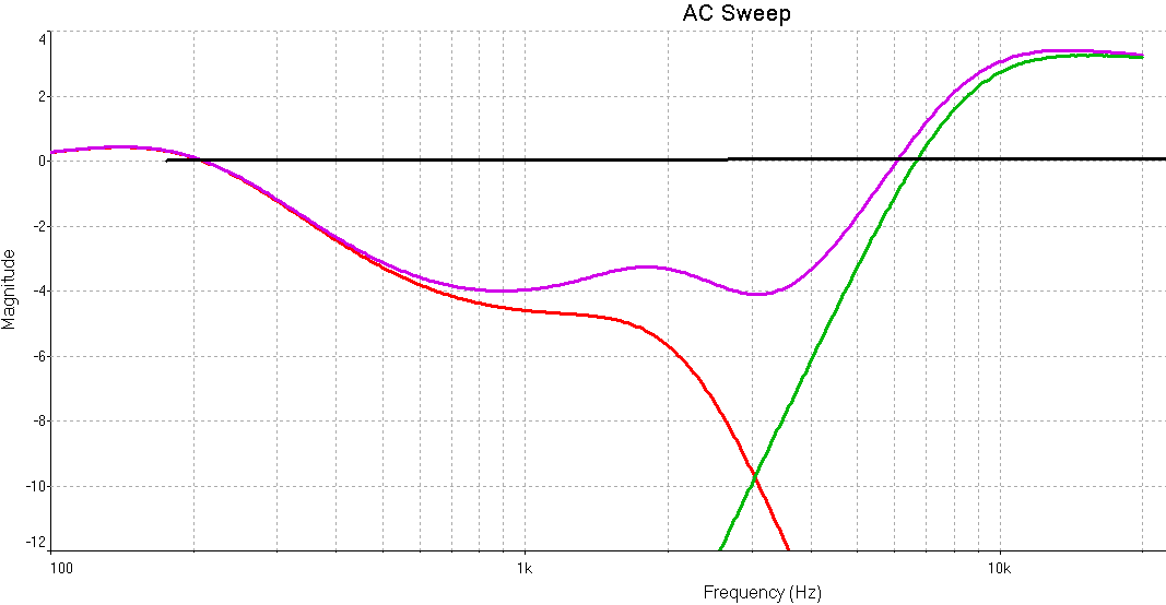Симуляция АЧХ фильтров по напряжению, схемы замещения подобраны в Схемы замещения динамиков