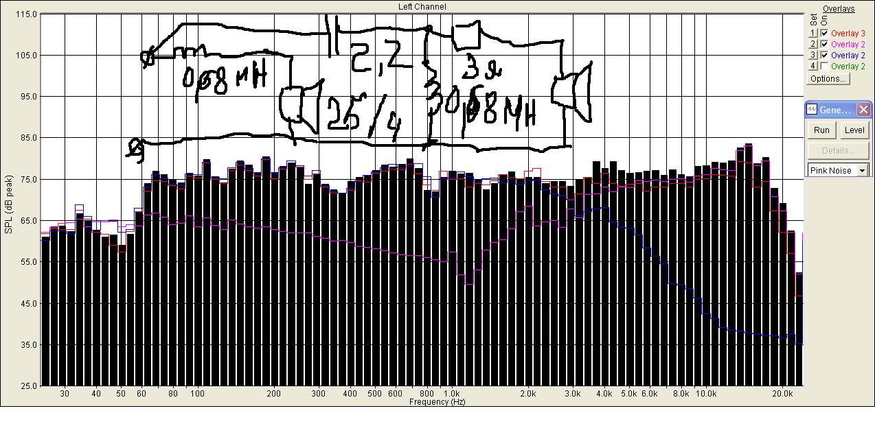 Зелень - без фильтра, бордо - с гасилкой 3Ом, синий - без гасилки. Схема как у Вас на процитированной картинке. Мерил в щите по оси.