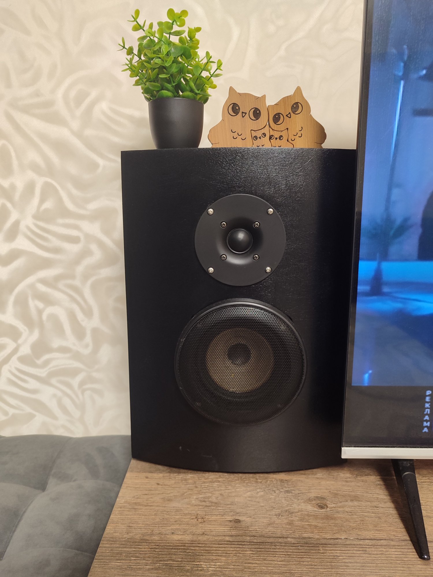 Одна готова. Вторую сегодня буду оклеивать. Пленка немецкая, дорогая- 2метра почти 700 р. Раздобыл пару микрофонов и установил REW. Будем пробовать мерить. Ну а если не получиться- пофиг звук и так устраивает.