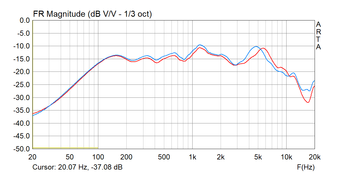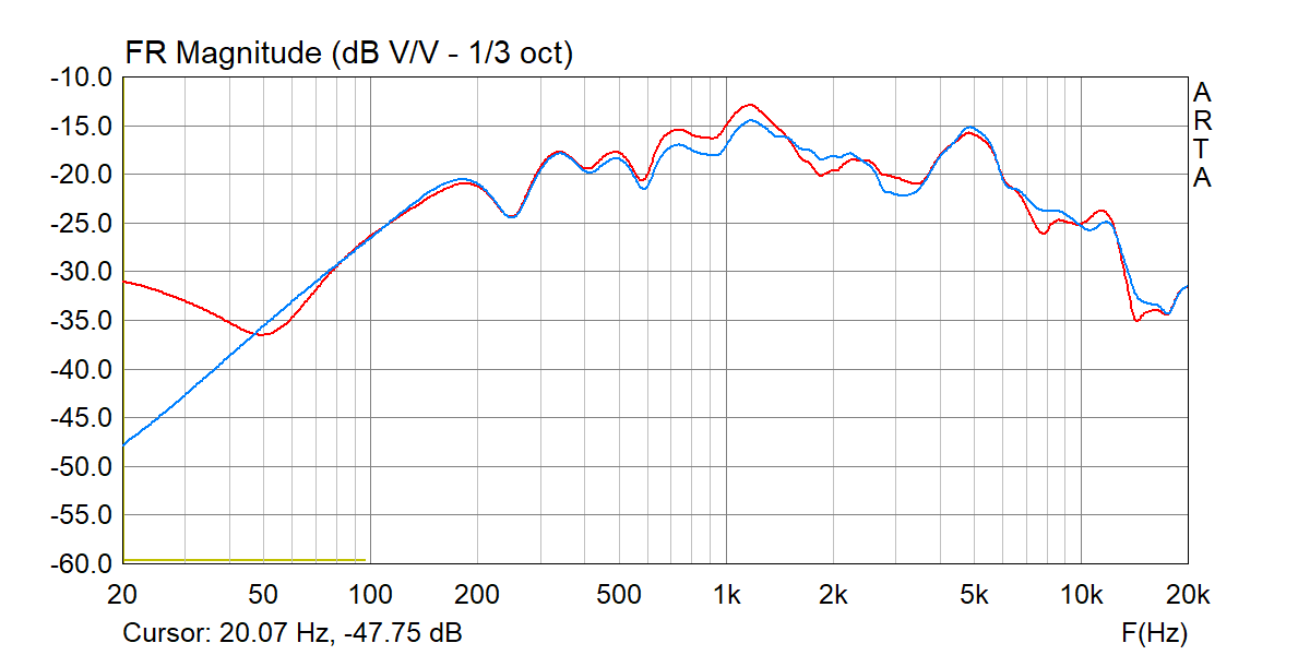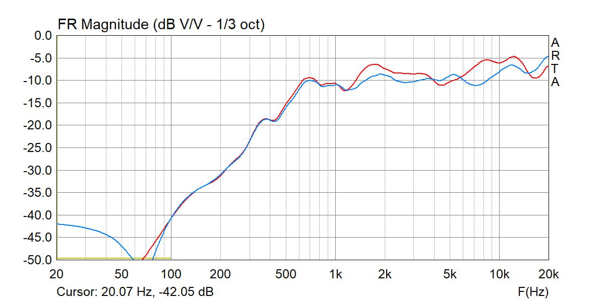Но, не помогло. Рупор имеет выступающее горло, т.е. по идее оно должно стыковаться с фланцем ВЧ. Если рупор положить на ВЧ динамик без гриля, то АЧХ отличная (красная кривая). Но как только с лицевой панелью - все криво. Вокруг излучателя наклеил уплотнитель, особо не помогло (синяя кривая):