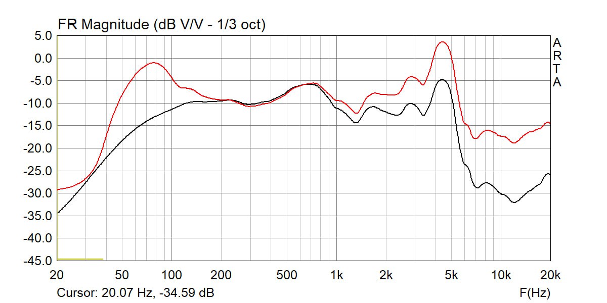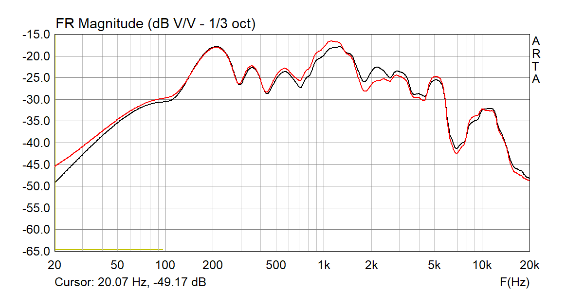 Поставил динамики в корпус будущей АС. Без ЗПМ. Расстояние 30 см, громкость на одном уровне. Окно 10 мс.
