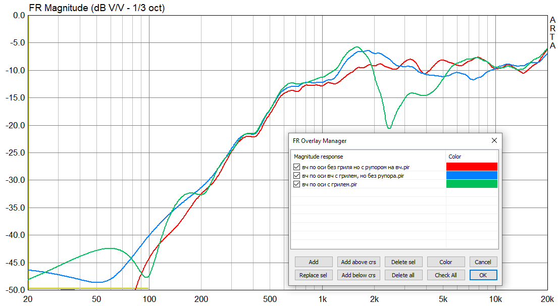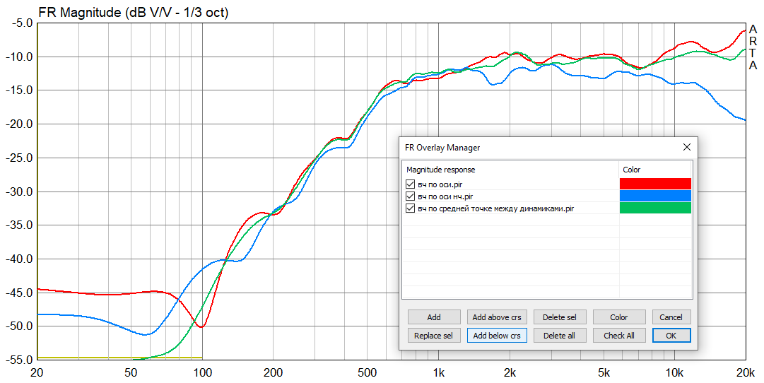 ВЧ динамик. На одном графике изображены 3 измерения, по оси ВЧ, на средней точке между динамиками и по оси НЧ: