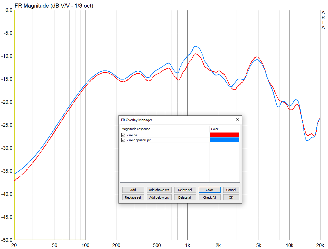 По оси НЧ с грилем (красная) и без гриля (синяя):