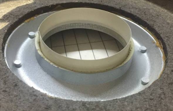 Ставлю гриль и добавлю проставку из тонкой бумаги, которая будет плотно прилегать к горлу и к фланцу. С обратной стороны проставка выступает на 5 мм: