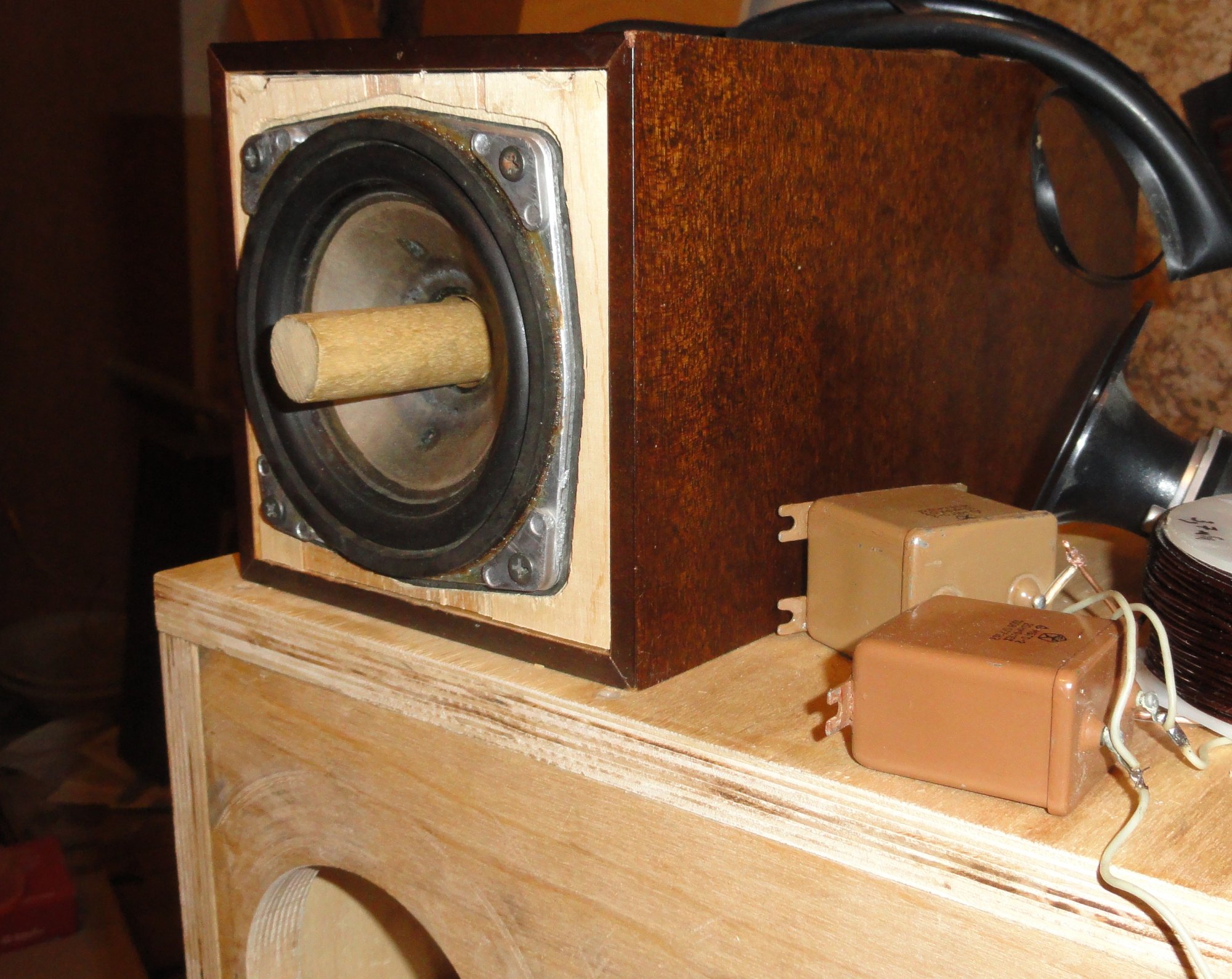Пару одинаковых басовичков можно соединить в схему как сделано у KEF Coda9s . вНУТРИ ящика в отдельном отсеке вмурован НЧ динамик, дует в порт . Включен через конскую индуктивность в 16 миллигенри на железяке.