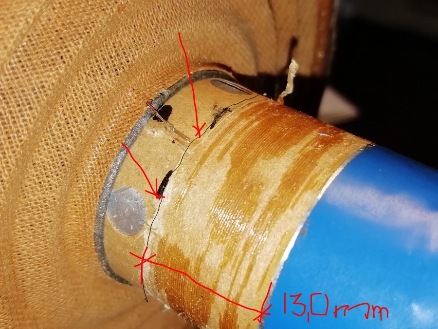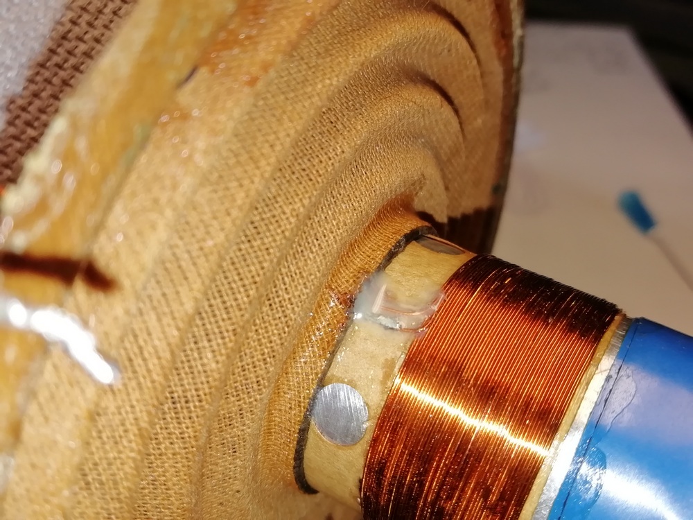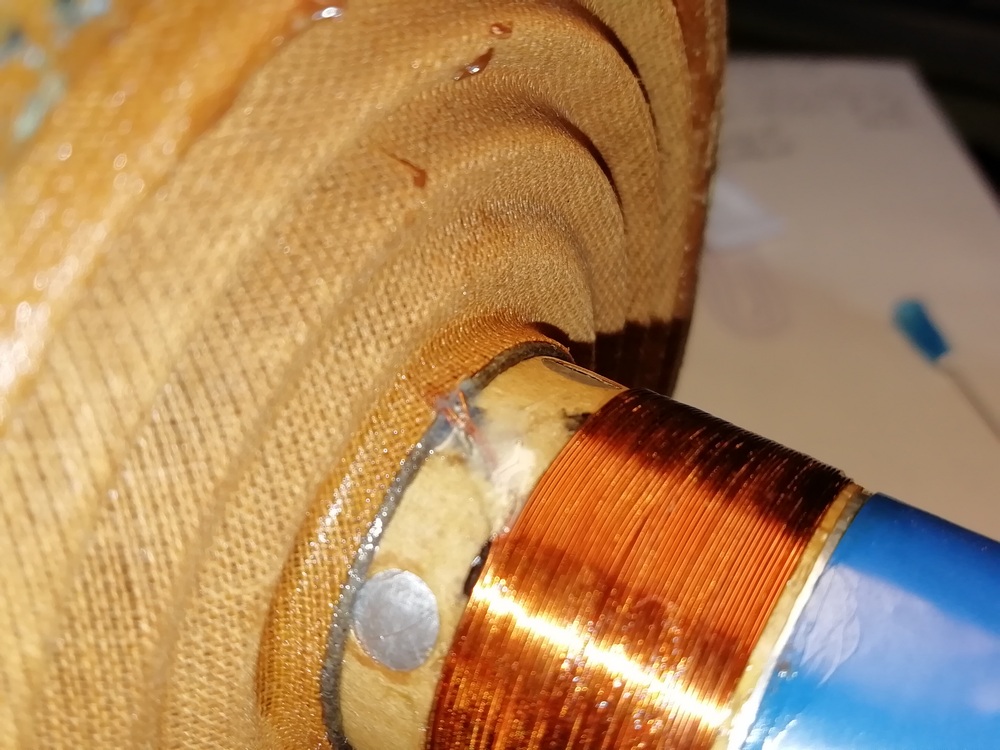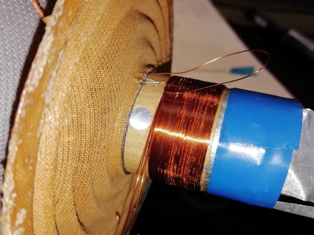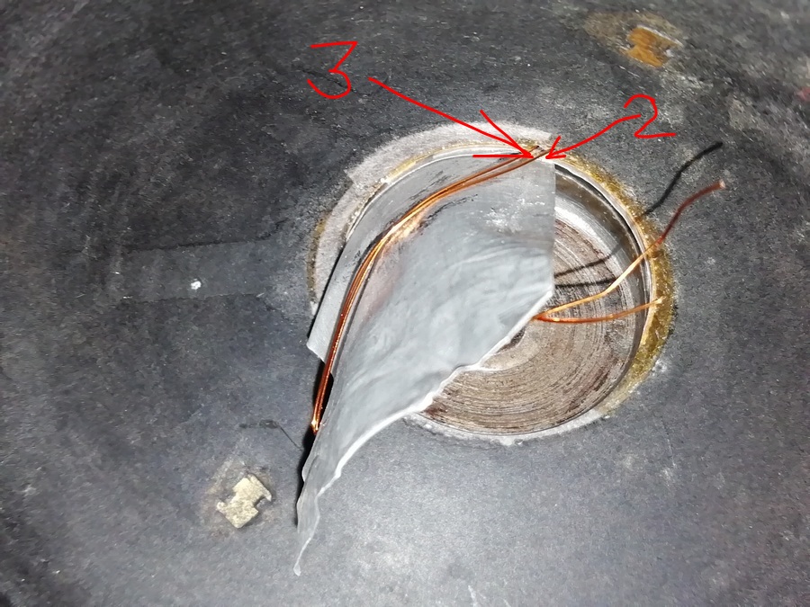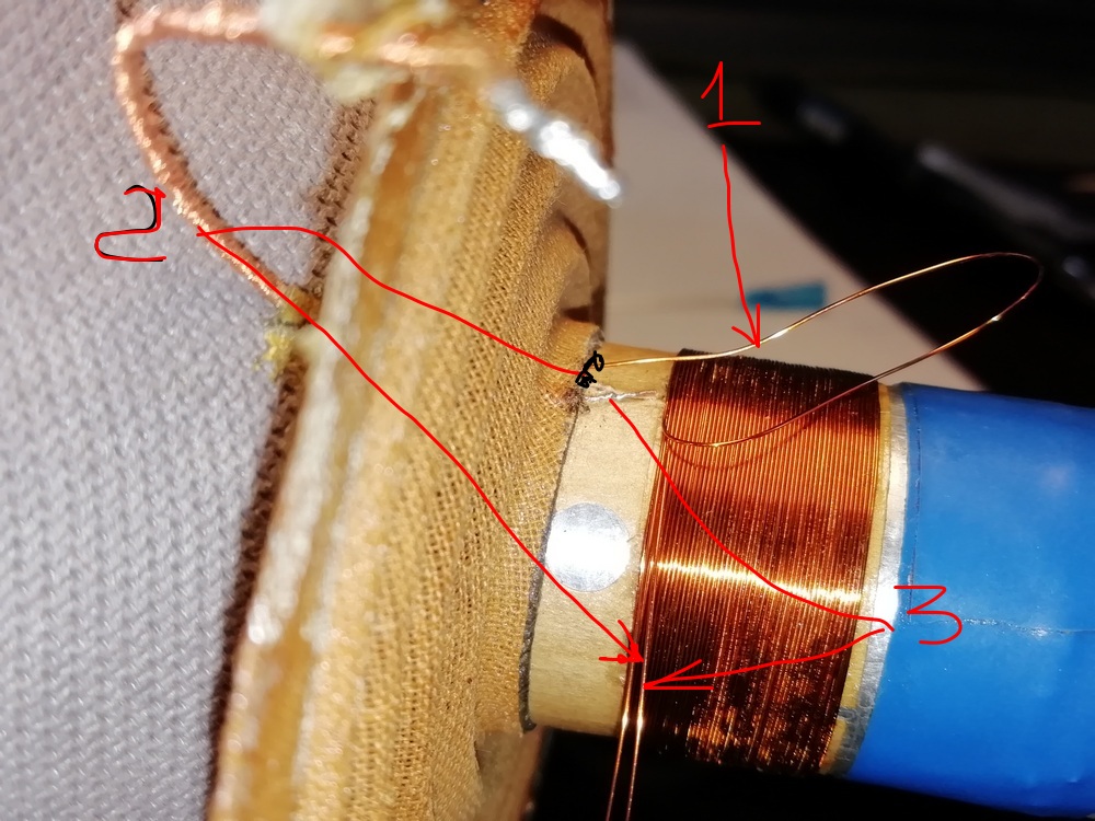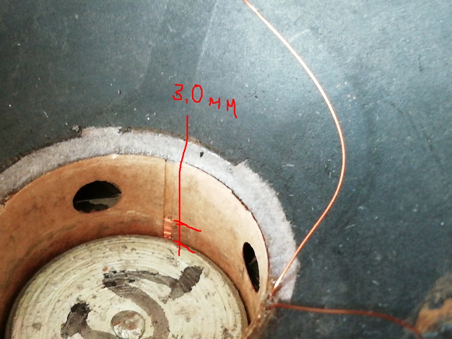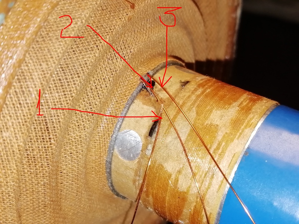 По окончании намотки, провод был зафиксирован секундным клеем и провод №1 через заранее приготовленное отверстие был выведен на лицевую часть диффузора