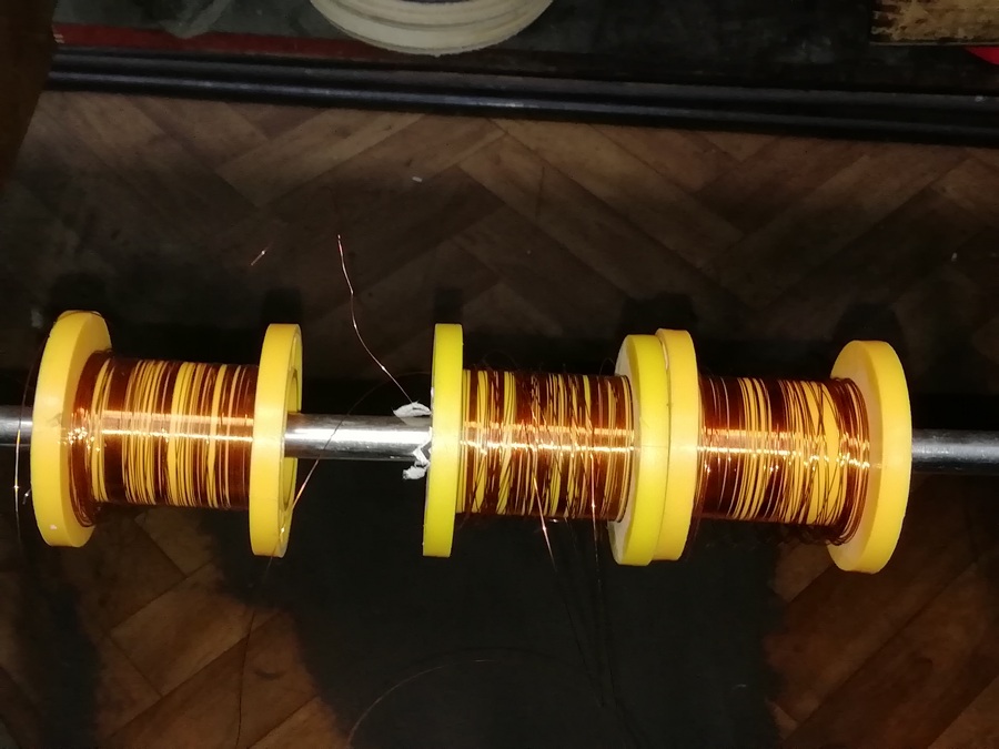 Намотано: Во внутреннем слое 16х3=48 витков. В наружном 15,5х3=46,5 витков. Re=3,7 ома.