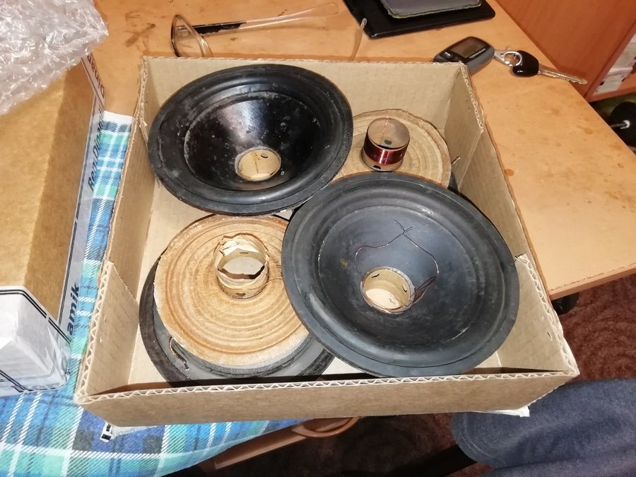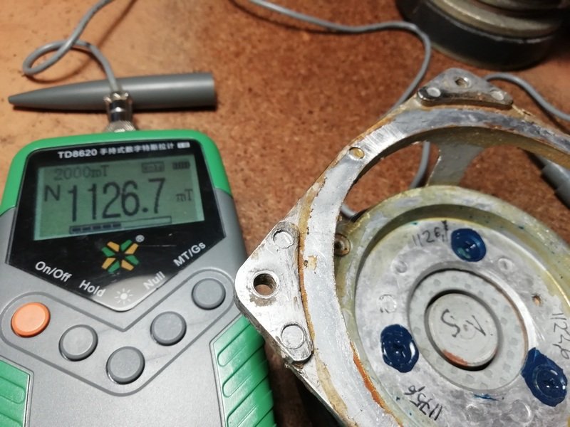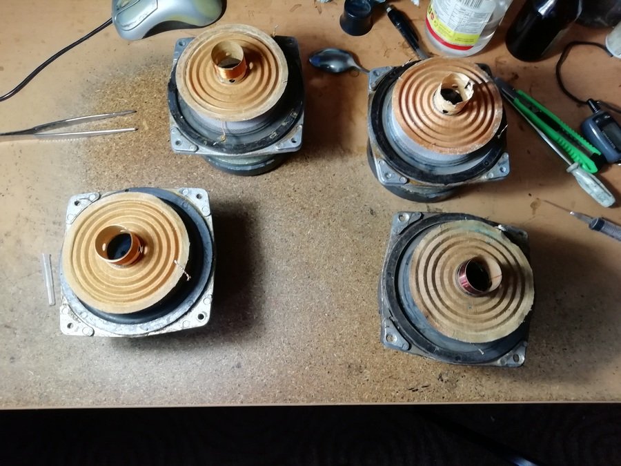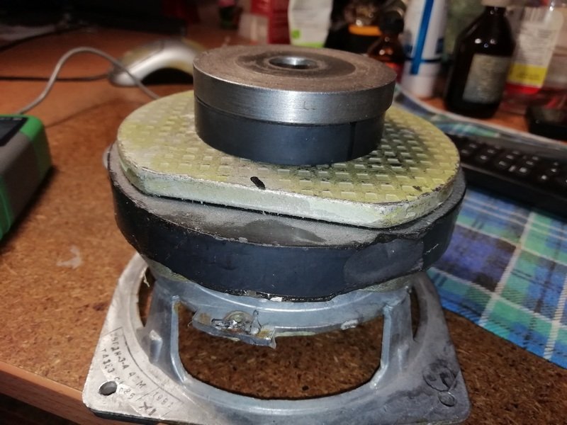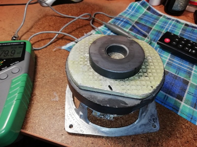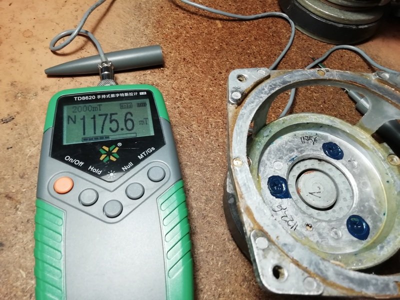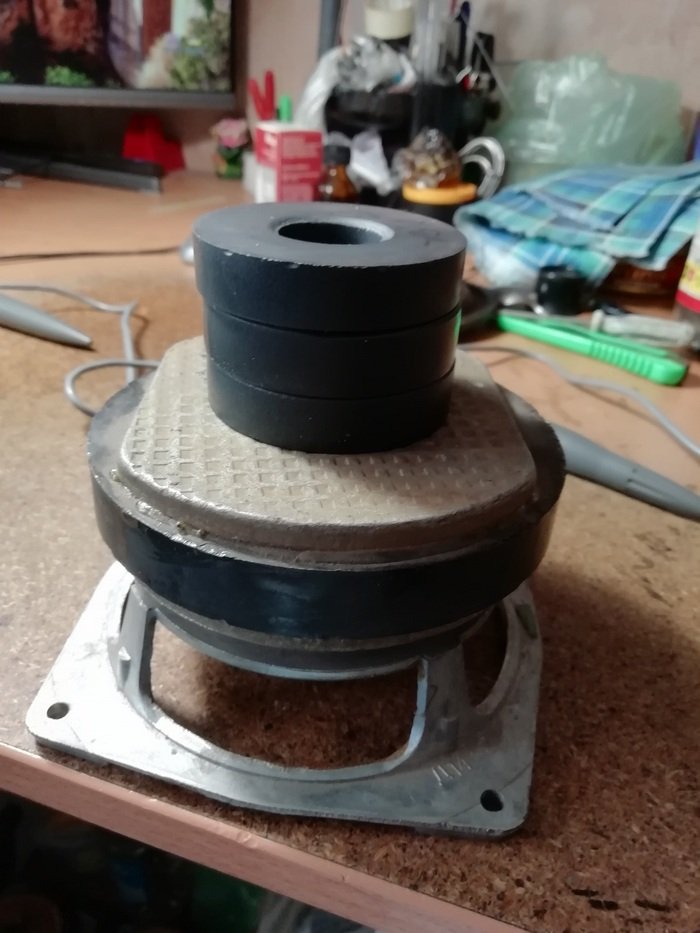 Если ещё железо 3-5мм на противомагнит положить, индукции будет ещё больше в зазоре.Собрались у меня все четыре динамика и все, в разобранном состоянии