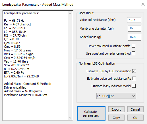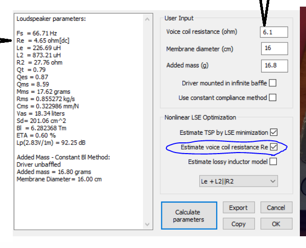 Вот давай так, что бы не устраивать тут базар вокзал, ввел значение сопротивления катушки измеренное мультиметром непосредственно сейчас, слева показания Re, взятые из кривой импеданса, справа введеные в ручную, повлияло ли это существенно на итоговые результаты?