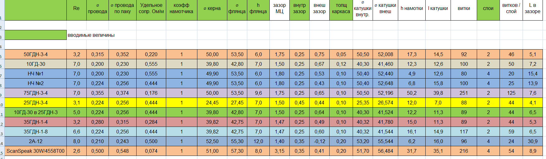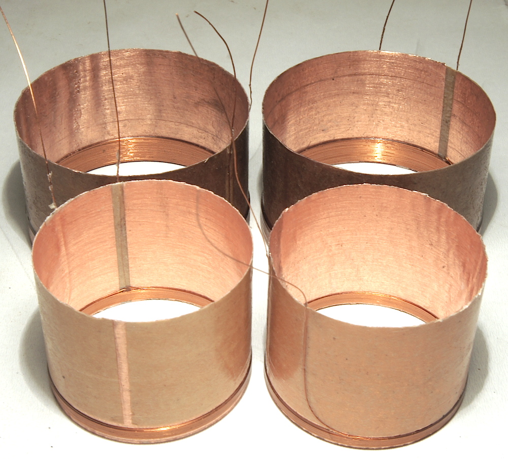 Впереди катушки для СЧ, позади НЧ. НЧ, кстати, для динамика на раме 35ГДН, цепь со 134-ым ферритом и 2" катушкой. Чисто для сравнения: Re - 6.7Ω, L - 18.5 м., вес - 10.93 гр., медный каркас толщиной 0.05 мм.