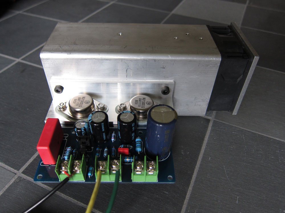 Блок питания трансформаторный (30 Вт), ток обмоток до 0,6 А, напряжение 20 В. Радиатор временный и скромный, поэтому ток покоя выставил 0,35 А.