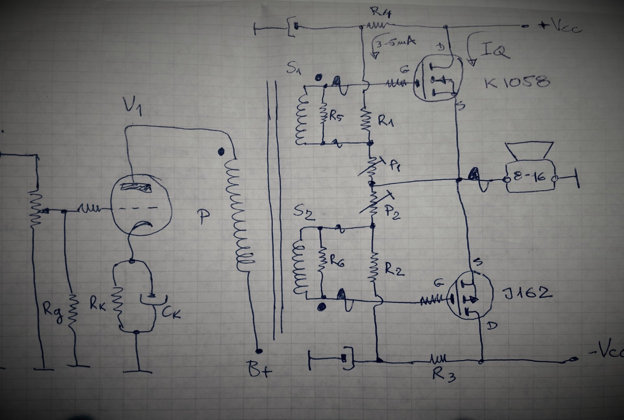 Режим А для этой схемы полная ненужность. С током в 200 мА и питанием два по 30-35 вольт звучит превосходно. даже с лампой куриной по мощности. Не говоря уже про могучую 6П14П да с дросселем в нагрузке.