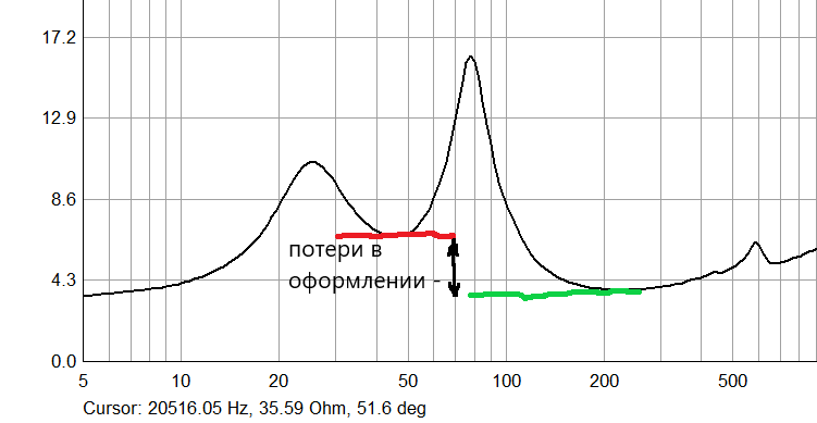 Провал между пиками имеет большое значение импеданса, и есть штычки. Низкая добротность корпуса, есть щели. КСВ только-только показывал в другой теме.