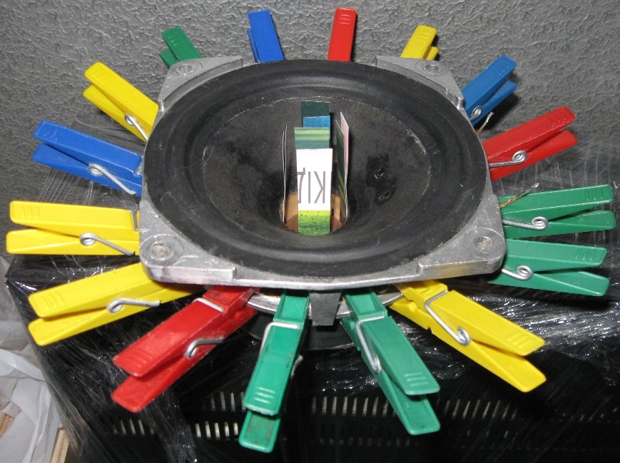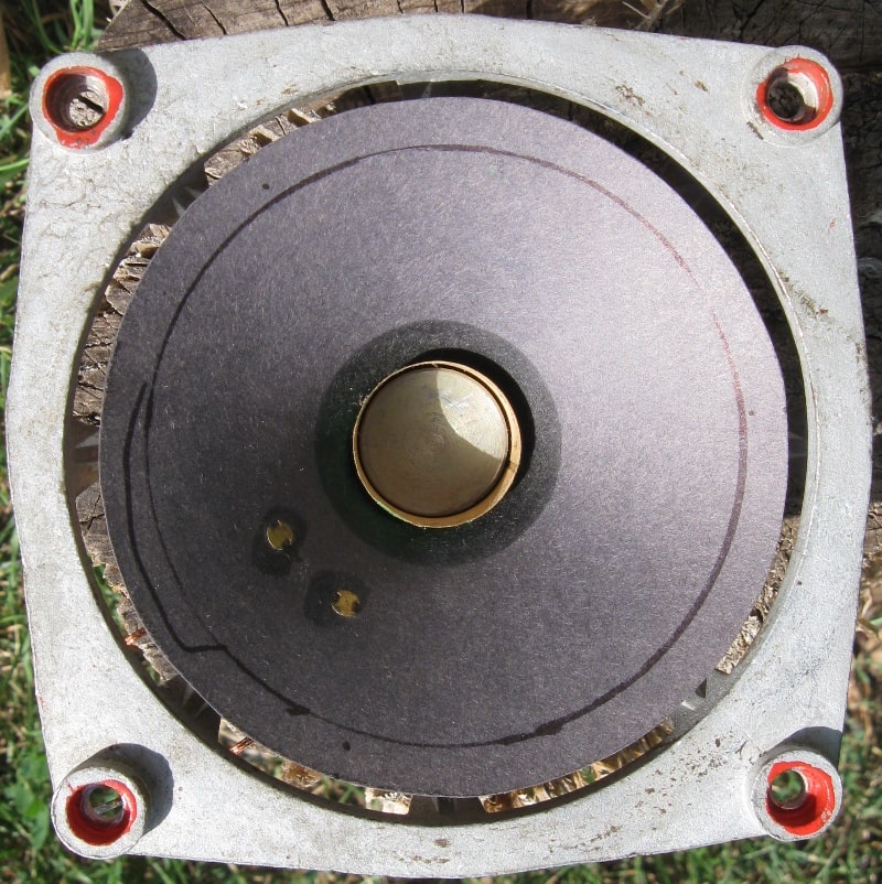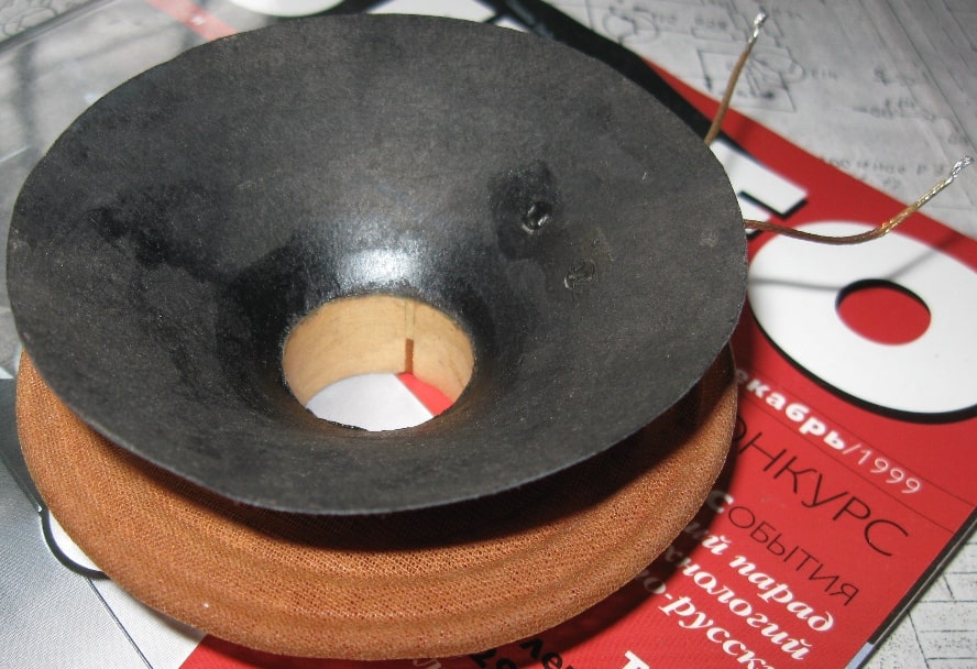 Ставил магнитную систему от 10ГДШ-1, целиком, лучше на неглубокую раму от 6ГД-6 (15ГД-14). Диффузор чаще всего использовал от 4ГД-35 (4ГД-36). Подвес широкий, тканевый, мягкий, полутороидальный, делаю сам. Но можно и новодельный лёгкий ППУ. ЦШ выбирал пожёстче. Пылезащитный колпачёк брал от доноров диффузора, подходят идеально, с установкой прямо на место вклейки каркаса катушки. Каркас ЗК алюминиевый, 60 мкм, с двумя антикомпрессионными отверстиями выше намотки, диам. по 4 мм. Высота трёхслойной намотки 6 мм. На каркасе выше обмотки - кабельтная бумага 0,1 мм. Провод обмотки и клей термостойкие. Выводы импортные, витые, не плетёные.
