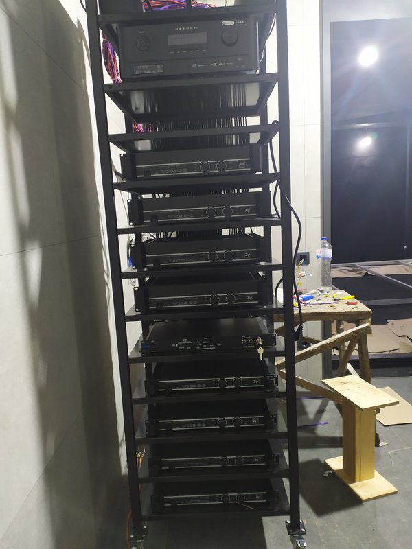 Вот стойка с усилителями, работающими на линейные массивы и тылы в ДК (находится в подсобке).