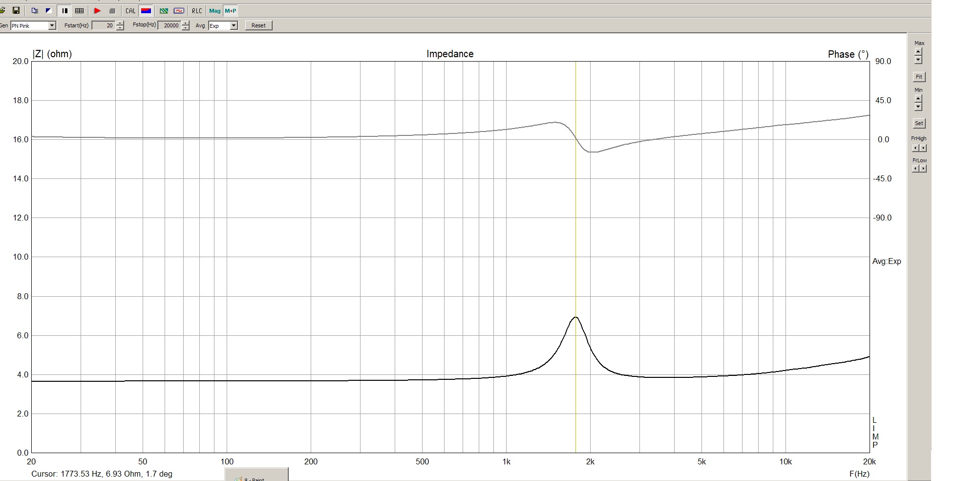 Это у первого динамика, у второго импеданс каплю выше, не привожу, резонанс совпал точно - 1700 Гц. Хотелось бы пониже с учетом того что желательно делить на октаву выше, но не плохо. Индуктивность катушки низкая, около 20 мкГн, полная добротность примерно 1,5.