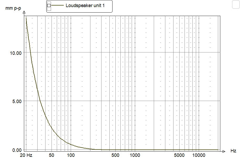 Амплитуды смещения диффузора от частоты (АЧХ) и с ним же - скорость движения диффузора в момент перехода через точку равновесия (положение покоя). Только мощность нужно задать какую-нибудь для обоих графиков. Можно на ваш выбор. Например, для отдачи 85-90 дБ с метра на пике 200 Гц