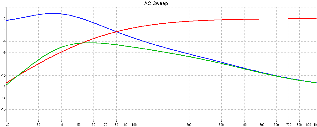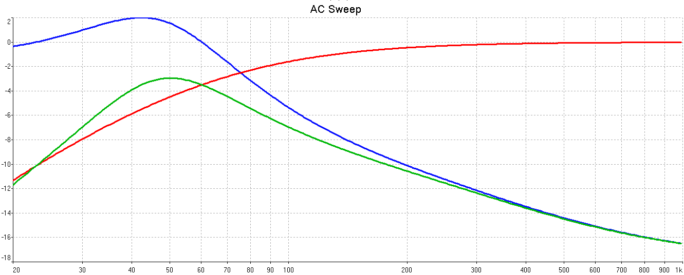 Результат для варианта с 3,3 Ома активного. Синяя - АЧХ по току, красная - АЧХ излучателя с Q=0,3 , зелёная - суммарная, результат.