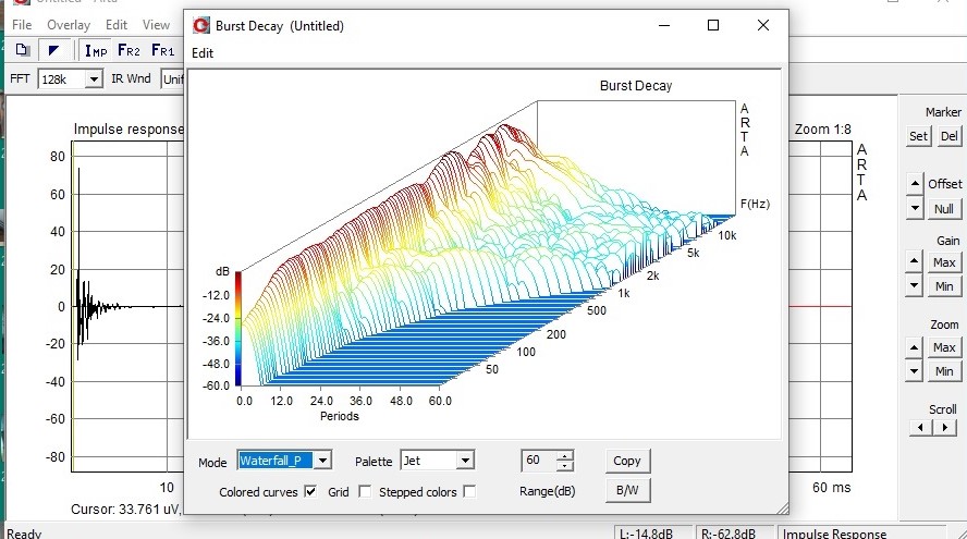 На частоте 100 Гц, где-то 12 периодов. Это 120мсек по -60Дб.