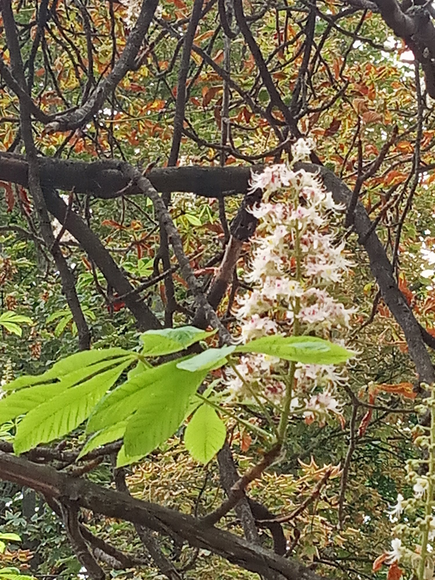 Сегодня увидел природную аномалию. На каштане вперемешку с засохшими листьями (каштаны по всей Европе болеют) и спелыми каштанами пораспускались молодые побеги, и он зацвёл, в сентябре! Примерно пятая часть от своей кроны, вразброс.