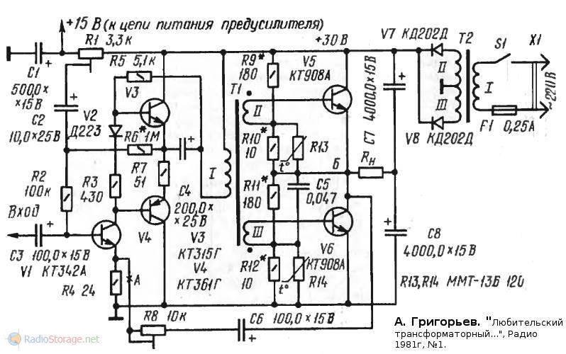 Глянул схему, не придраться. Читаю, площадь радиаторов не менее 400 см кв. Ого! Дальше: ток покоя 400-500мА. "Внушаить!" . Трансформатор понижающий 4 к 1. То что надо. Молодец автор, создал достойный аппарат. На том, что было под ногами в те годы.