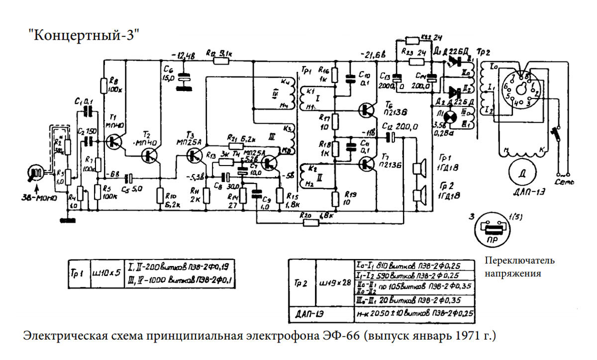 По решениям просто суперская схема, на копеечном германии сделано , не придраться.Вспомнился из молодости проигрыватель Концертный, там стоял в схеме фазоинвертора малюсенький трансформатор. Нашел в сети схемуПосмотреть вложение 78785Посмотреть вложение 78786