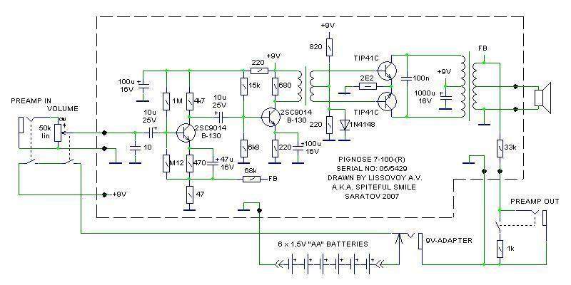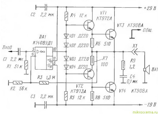 Сам себе мощник 4,5 вт для комбика или бумбокса с однополярным питанием (из 80х). Есть схема с доп. транзистором для снижения искажений.