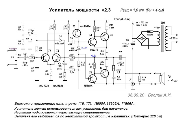 "Взад ''умощнители'' не нашёл ни 1 схемы, но по идее - можно."- и не найдёте , как и писал Виталий .Я предлагал т.Динозавру,сам делал , дополнительные транзисторы PNP + NPN туда так и просятся, всё для них готово ,базовые резисторы добавить. Можно делать мостовую схему .А вот с коррекцией придётся повозиться или тупо загрубить избыточной ,но тогда нафик надо такое чудо