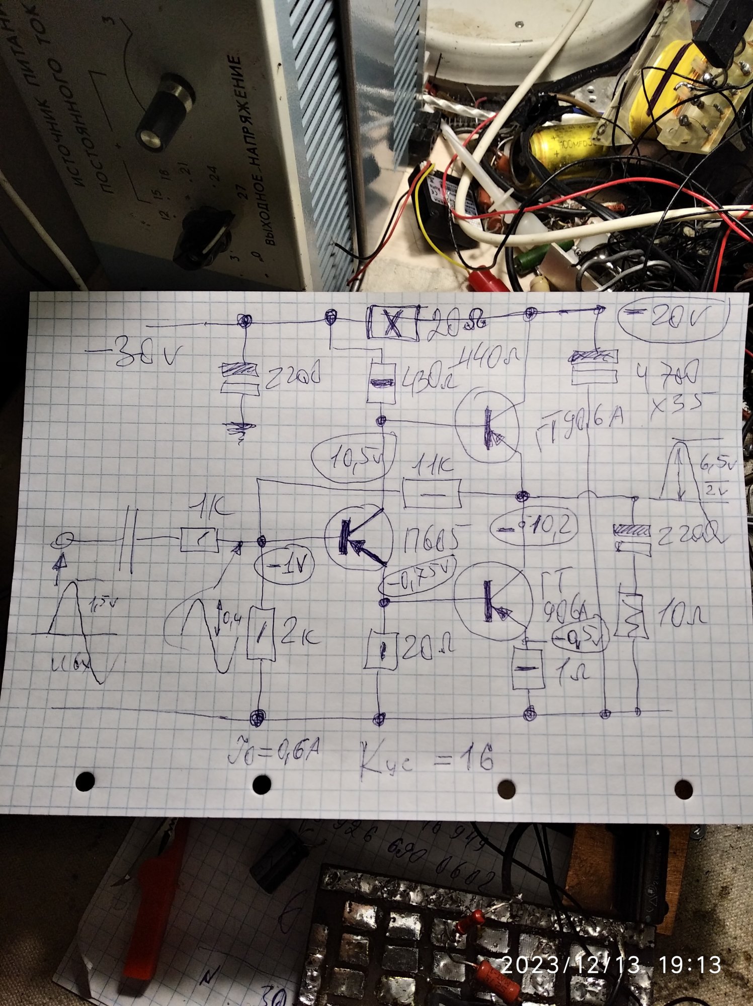 Прощальная проверка макета выявила все же источник нестабильности при прогреве . Им оказался нижний выходной транзистор ГТ906. И если остальные два на нагрев никак не реагировали, то нижний , нагретый примерно до 50-55 градусов, снаружи, паялом, увеличил ток покоя с 0,5 до 0,62 А, потом остановился и уже не увеличивался, питание схемы просело с 20 в до 19 в. То есть, схема не уходит в разнос.