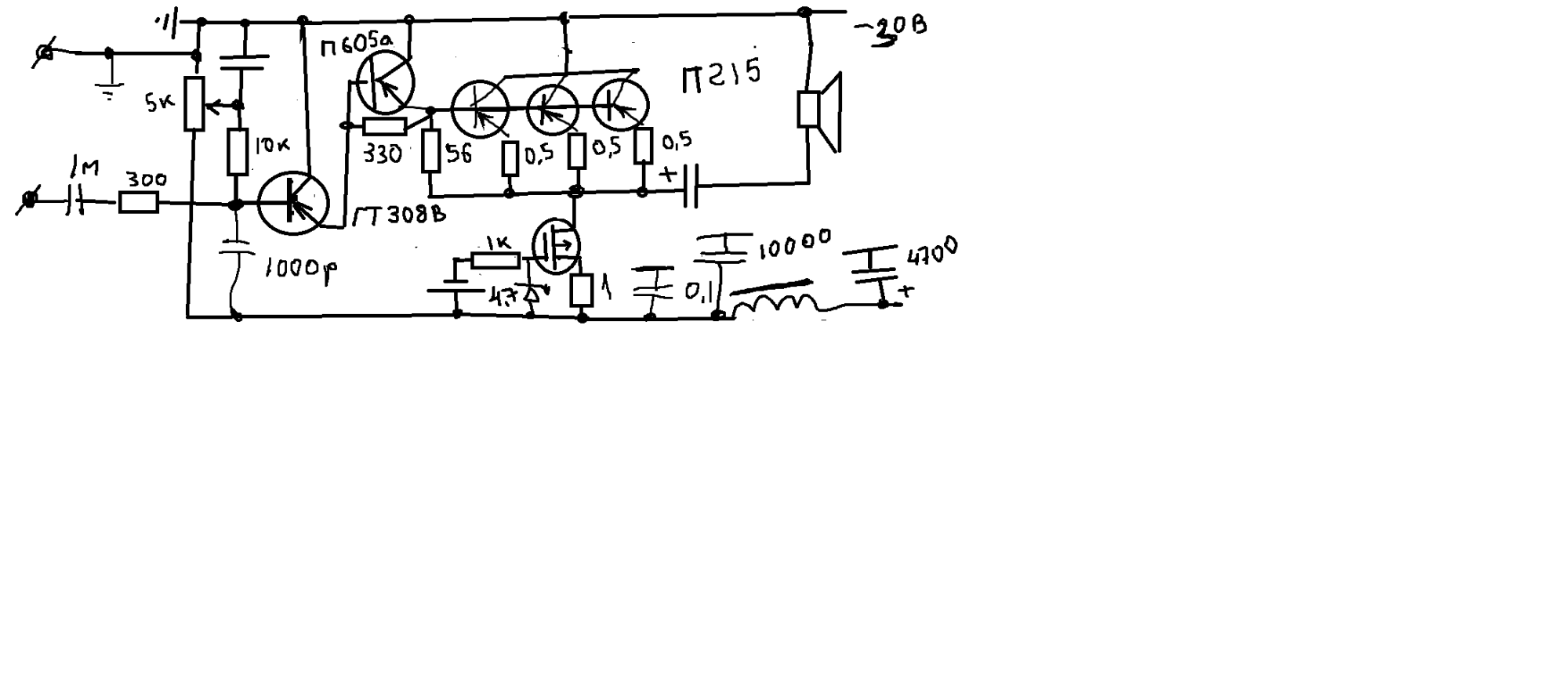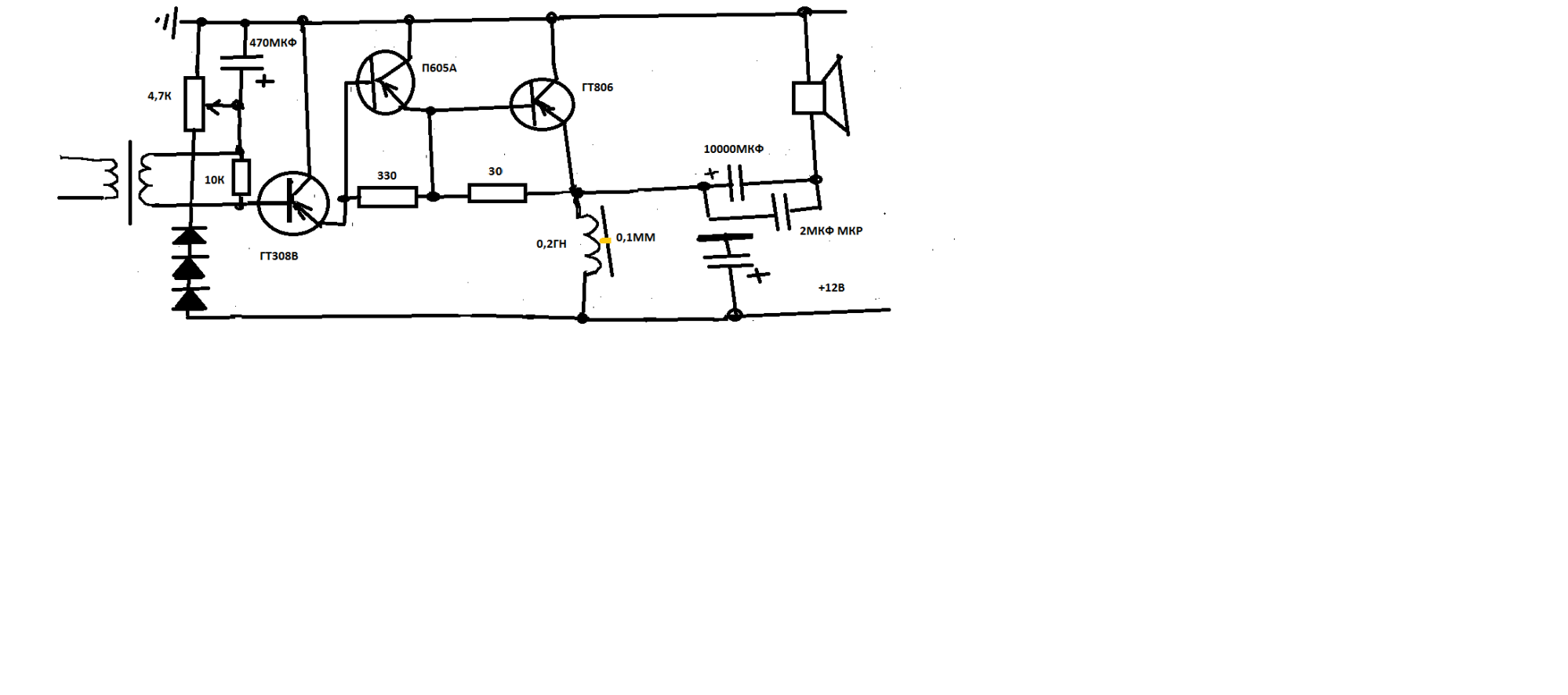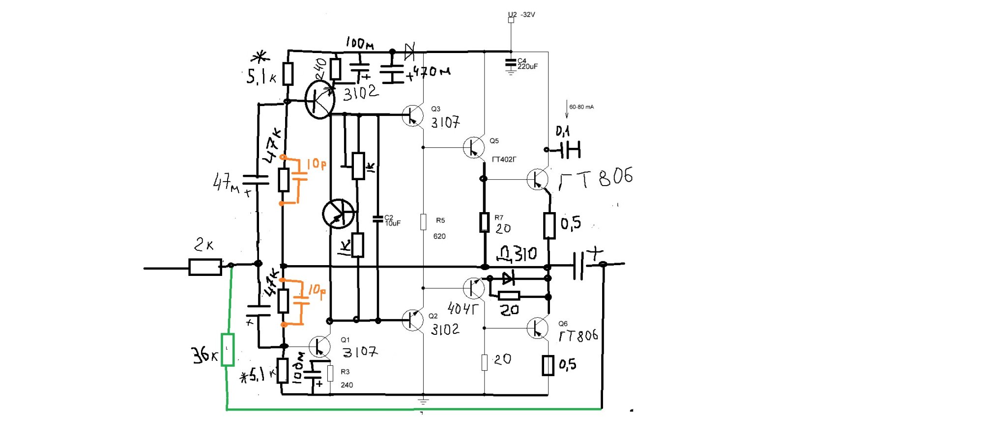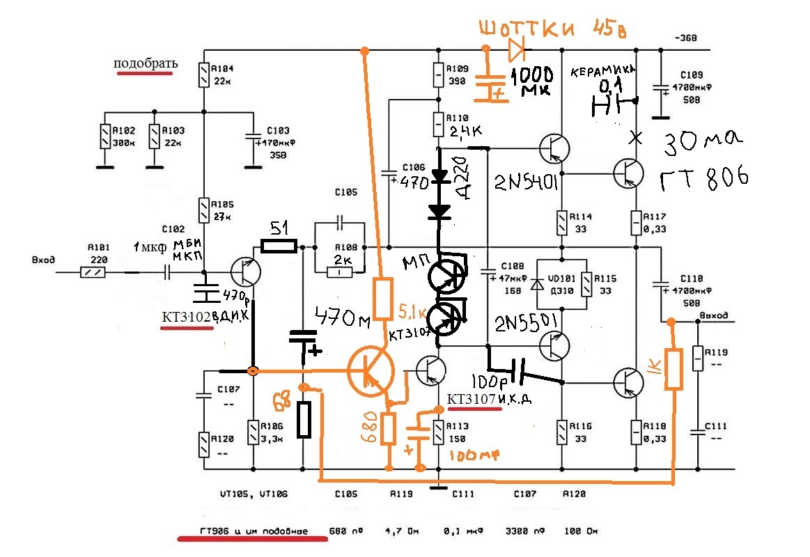 из германцев на выход хороши гт806, и прочие с высокой частотой,П605а отлично звучат но хилые и больше 5вт на них получить не получится,если большая мощность не нужна хороши гт402\404б,г,е,можно пустить по три впараллель и поставить радиаторы,резисторы 0.5...1ом при этом надо поставить каждому в эмиттер