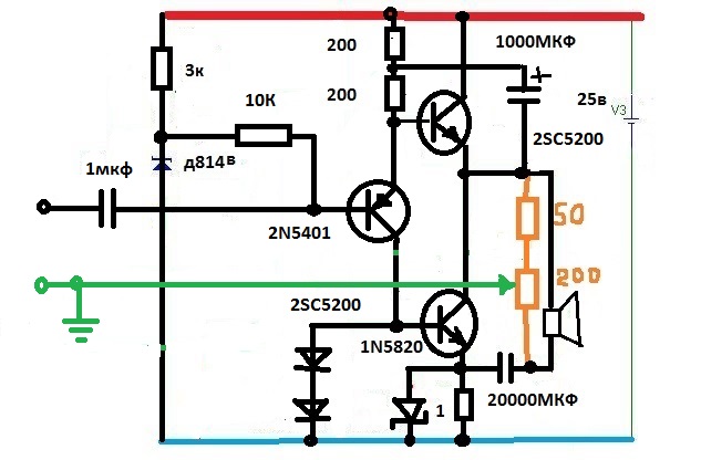 вот еще простой усилитель в экономичном Аклассе(ток покоя меньше в 2раза чем у Худа) с выходом на германии