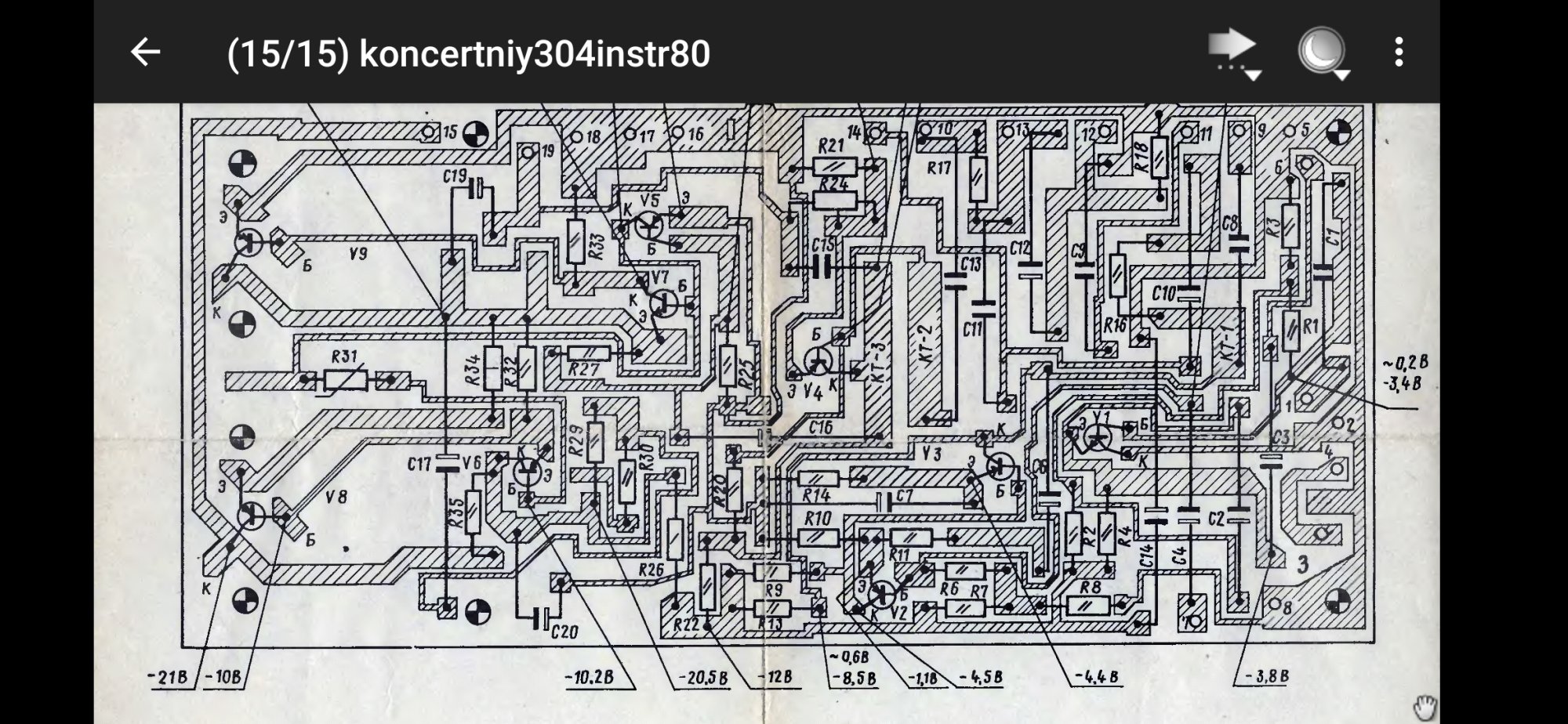 А я разобрался с концертной 304 сбоку отслоилась дорожка резистор r27 был 22 кОм при нём при 22 в пол питание было 8 Вольт сходил купил подстроечник 47 ком по факту 52 ещё б кривая была но к сожалению торопился ничего больше не было в магазине выставил пол питание на 25 Вольт поёт на максимальной громкости без искажений кроме c20 на 160вольт вместо 25, маленького конденсатора не нашлось в общем родной трансформатор слабый от импульсника идёт всё хорошо без просадок