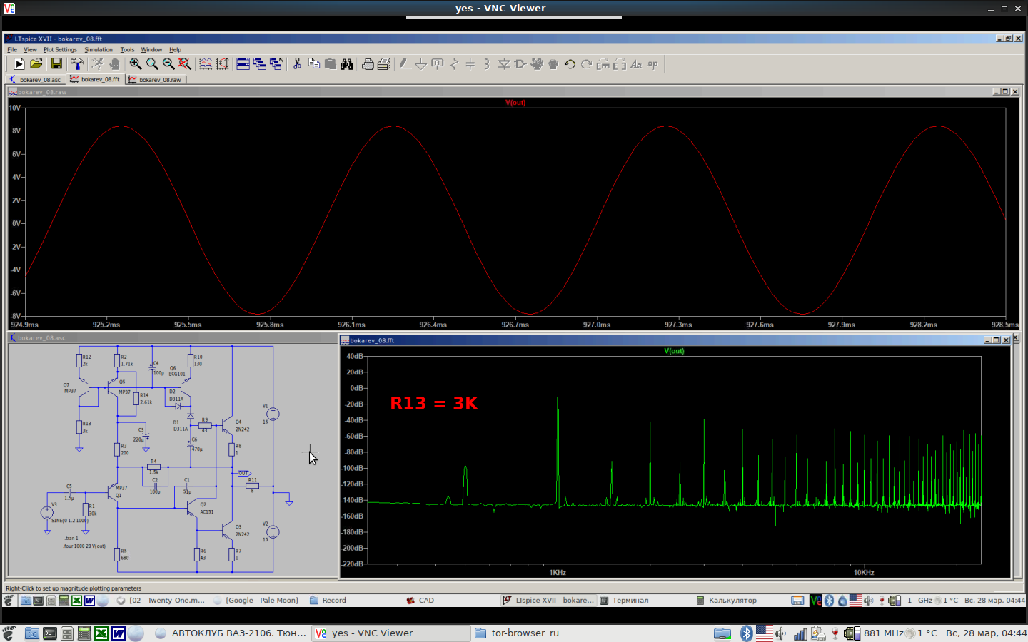 Ниже приведены результаты моделирования усилителя для двух значений R13.