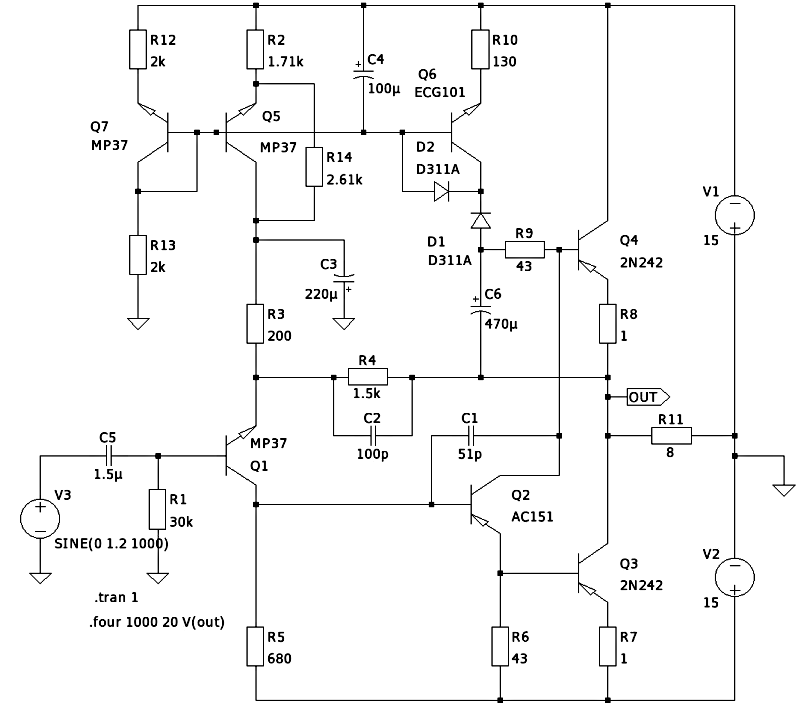 Что нового? Во-первых, был найден источник повышенных искажений. Им оказалась кривая модель транзистора AC127, которую я использовал в источнике тока (Q6). Поведение этого транзистора было явно неадекватным, что выражалось в странных выбросах тока при изменении напряжения на коллекторе, даже в активном режиме (пробой -?). Естественно, это не могло не сказаться на работе всего остального усилителя, а ООС не могла полностью устранить вызванную этим явлением нелинейность схемы. Замена AC127 на ECG101 полностью устранила это явление.